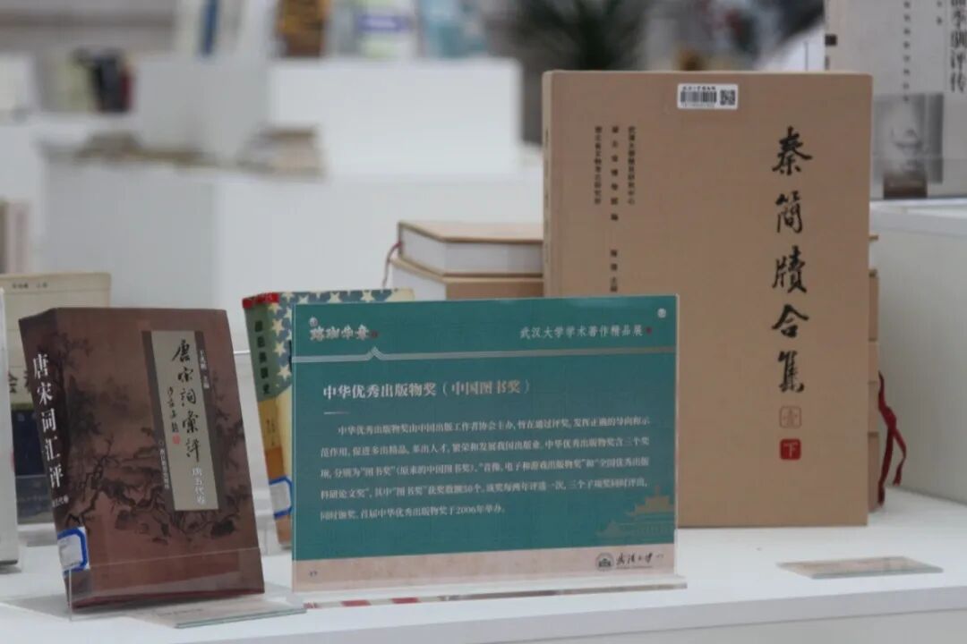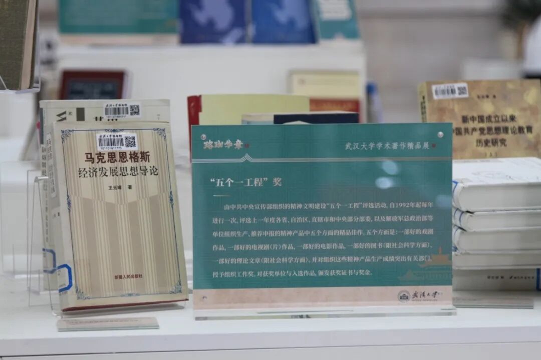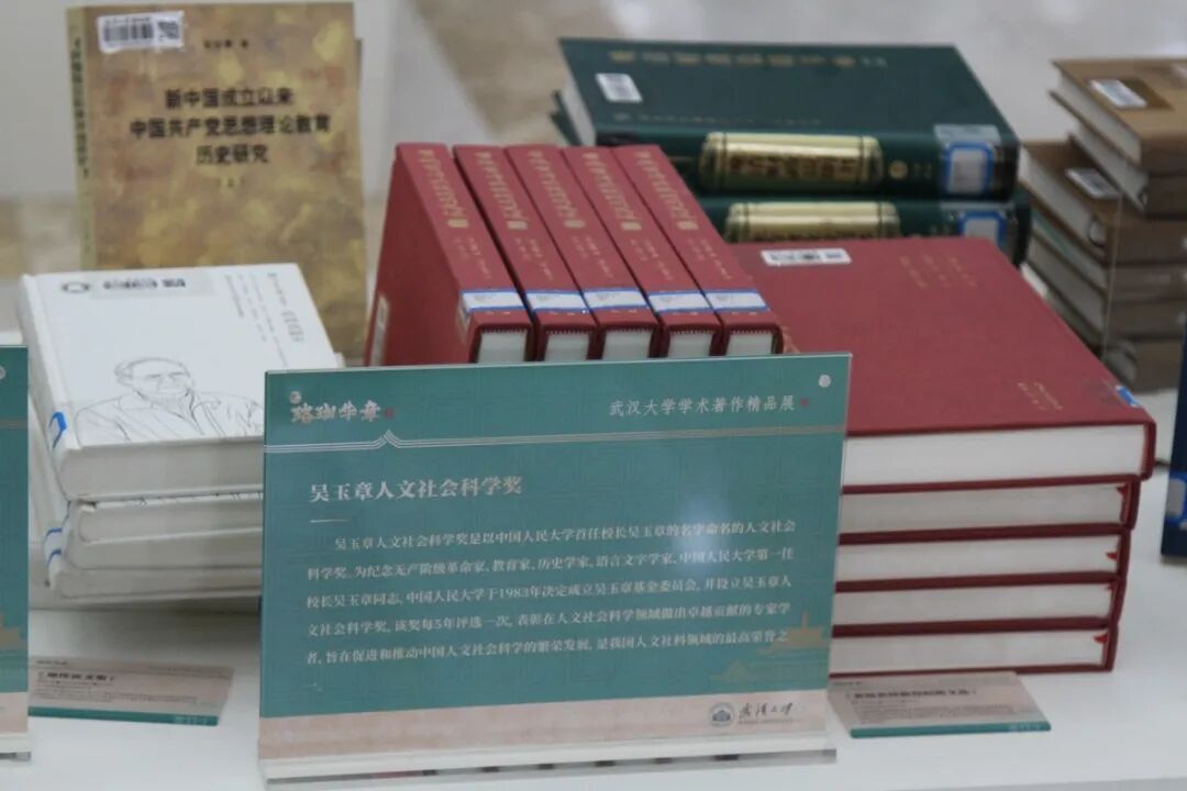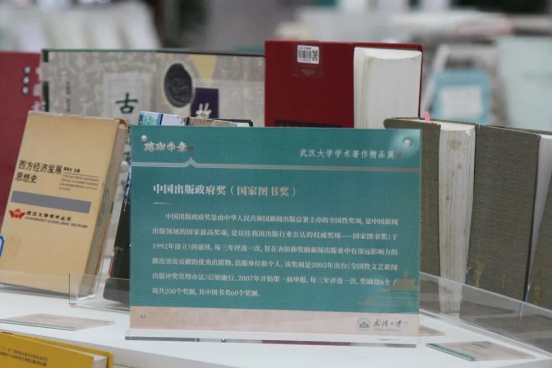 在“珞珈华章——武汉大学学术著作精品展”所列8个主题展区中,在最中间就是“荣誉鸿篇”展区,这里精选的武汉大学获得国家级、省部级以上奖励的学术著作作品(其中国家奖、部级二等奖以上、省级一等奖以上和部分特别单项奖),包括中国出版政府奖、“五个一工程”奖、中国图书奖、教育部奖、湖北省奖、吴玉章奖等近两百种;从展区位置到展陈图书的含金量都是当之无愧的C位,而在C位之中,最耀眼夺目的则是荣获国家级殊荣的这群星落: