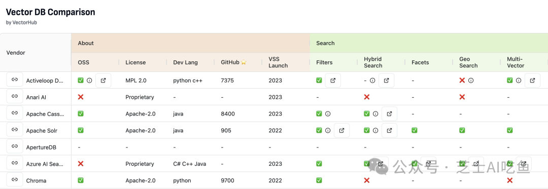 VectorHub 提供的 向量数据库对比 是一个很好的资源,它涵盖了 37 家厂商和 29 项特性(截至本文撰写时)。