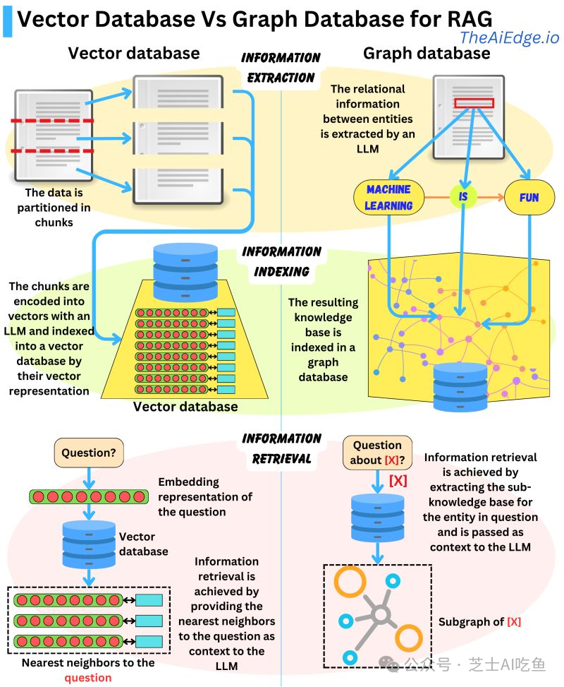 下面来自 Damien Benveniste 博士的图片讨论了 RAG 使用图数据库与矢量数据库之间的区别。