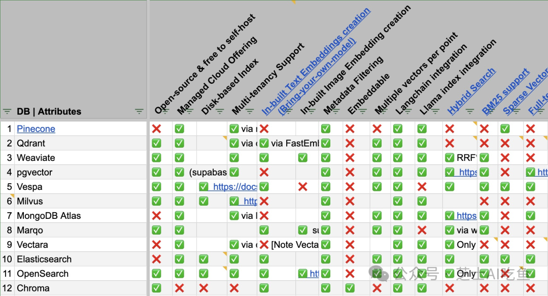 作为辅助资源,下表 (链接) 展示了一些主流向量数据库在不同特性维度上的对比: