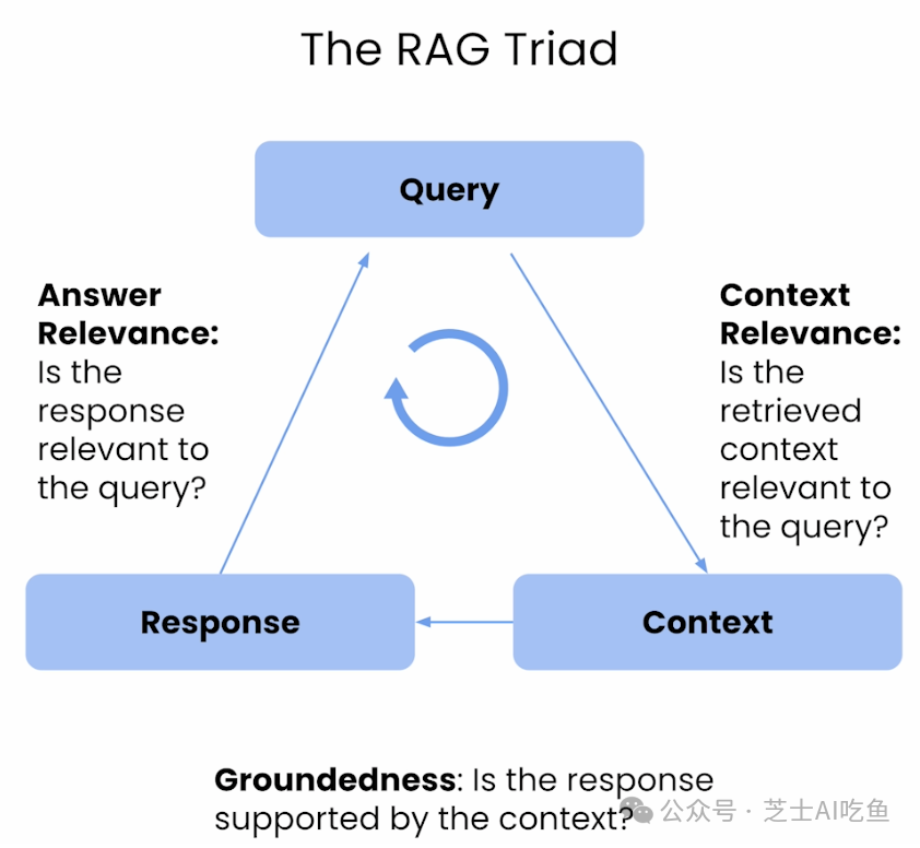 下图显示了用于评估 RAG 的“三元组”指标:扎实性(也称为忠实性)、答案相关性和上下文相关性。请注意,上下文精度和上下文召回也很重要,并且在较新版本的 Ragas 中被引入。