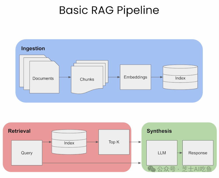 下图直观展示了 RAG 的三个步骤:数据摄取、检索和综合/生成响应。