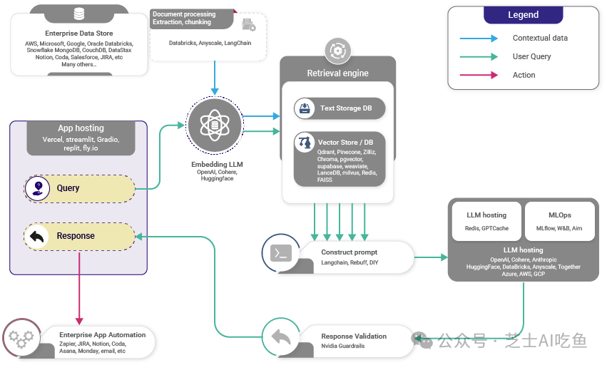 构建向量数据库:RAG 首先将内部数据集转换为向量并存储在向量数据库(或您选择的数据库)中。