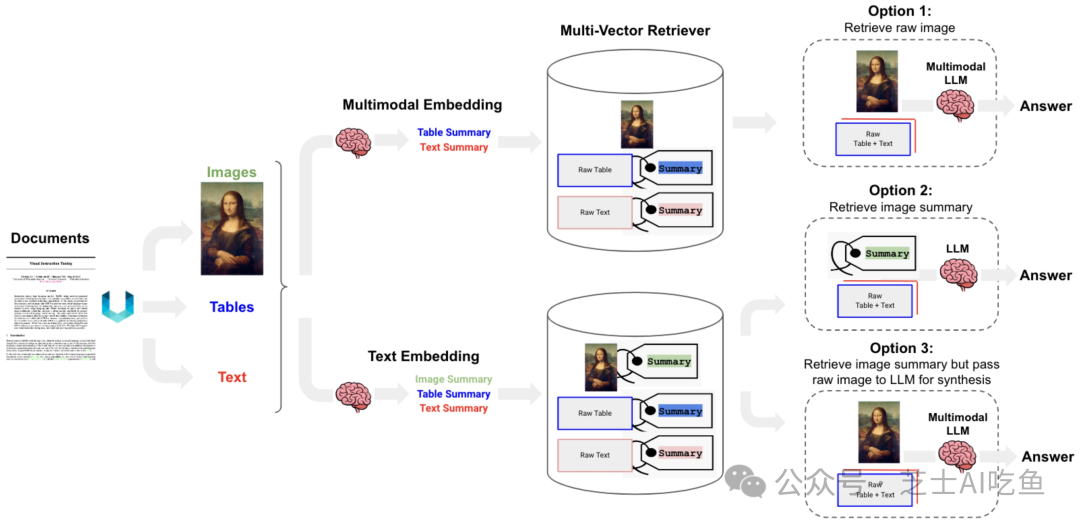 当不能使用多模态 LLM 进行答案合成时(例如,成本等),选项 2 是合适的。