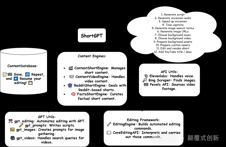 ShortGPT 可以处理大多数典型的与视频相关的任务,如撰写视频脚本,生成配音,选择背景音乐,撰写标题和描述,甚至编辑视频。该工具适用于短视频和长视频内容,无论平台如何。
