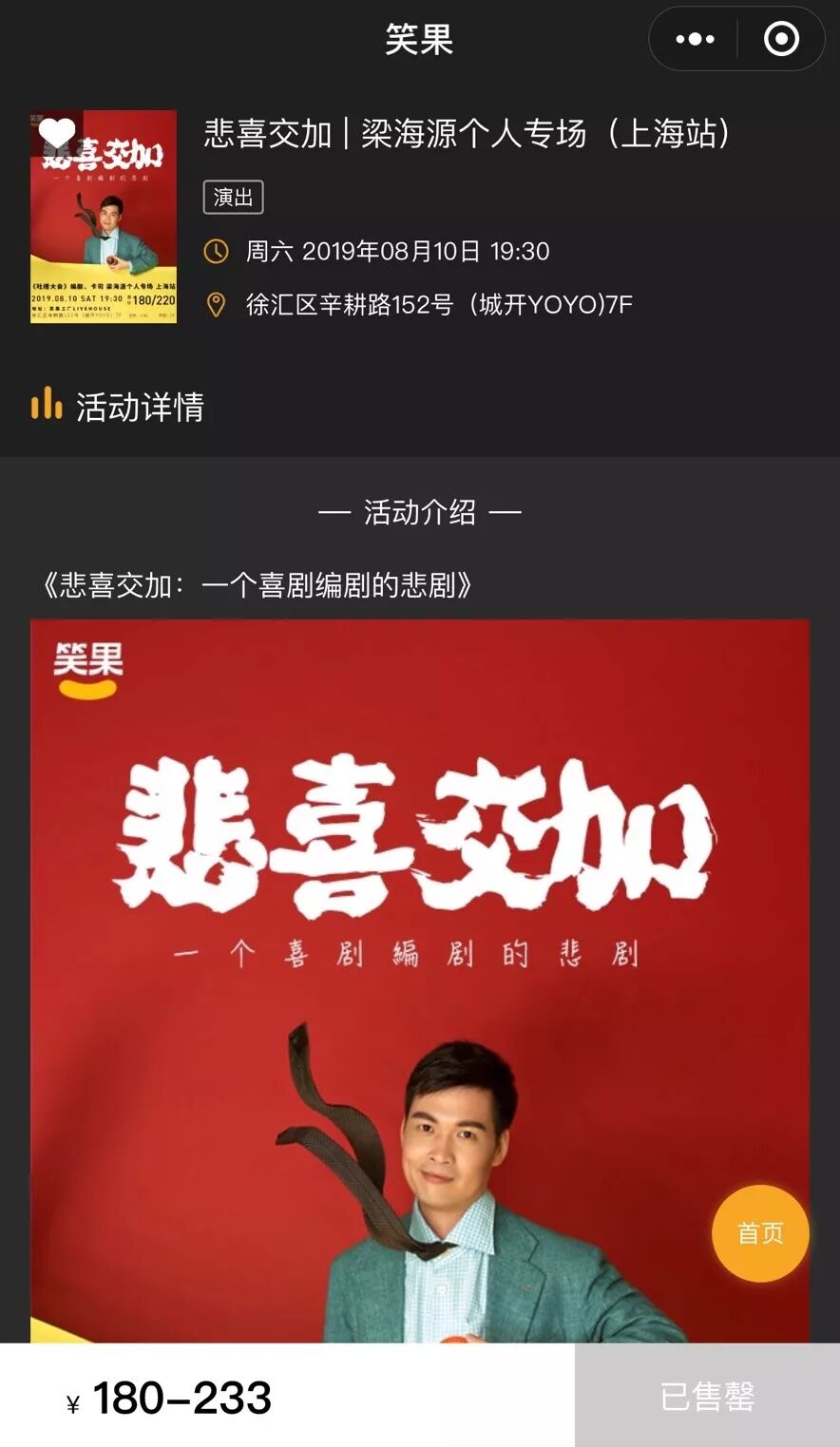令人好奇的还有脱口秀演员的薪资水平。Rock想全职,晓卉和卡姆多次提到涨工资,梁海源说赚钱很难“家里的钱很孤独,因为没有其他钱和它一起玩”。稍一观察,就会发现脱口秀演员大多是兼职的。吃瓜群众比较想知道的是,有没有“按梗算钱”这种传说。虽然脱口秀演员“穷”,但笑果文化看起来很“富”。从2017年获得1.2亿的A轮融资,到今年获得天图资本和南山资本的B轮融资。具体金额未披露,有媒体称笑果的新估值将为30亿元。在先后出品了《吐槽大会》《脱口秀大会》《周六夜现场》后,笑果文化还和喜马拉雅合作推出了《幽默工具箱》音频课程、创立线下消费场景笑果工厂、跨圈层联合举办喜剧脱口秀活动。今年8月,笑果工厂的livehouse也正式投入运营。虽然海源没进决赛,但他的个人专场《悲喜交加》可是一票难求。在笑果的微信小程序上,可以看到票价在180-233不等。而把几个脱口秀演员打包的“车间访谈”就更便宜,单场仅59。