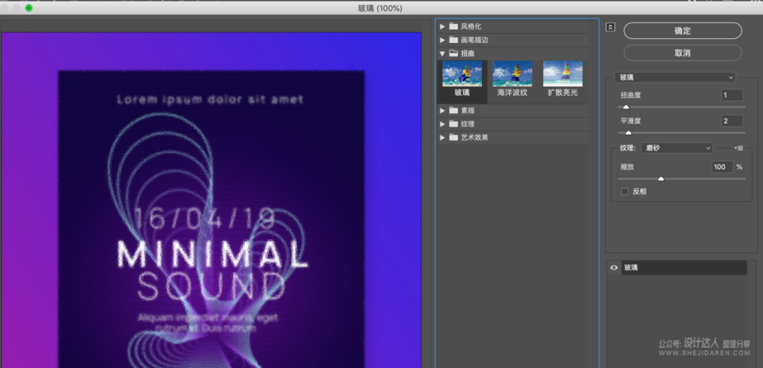 Step 5. 滤镜 → 滤镜库 → 扭曲>玻璃 (参数不要照搬,看自己的海报效果来调整)