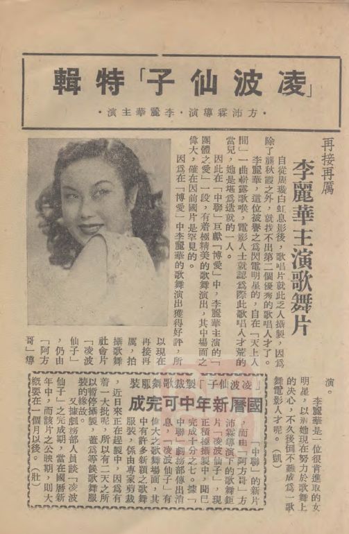 歌舞片难拍,因为缺乏歌舞人才和导演,足可称为集大成的是“歌舞片权威导演”方沛霖上海沦陷时期拍摄,李丽华主演,与东宝歌舞团合作的《万紫千红》(1943) 。