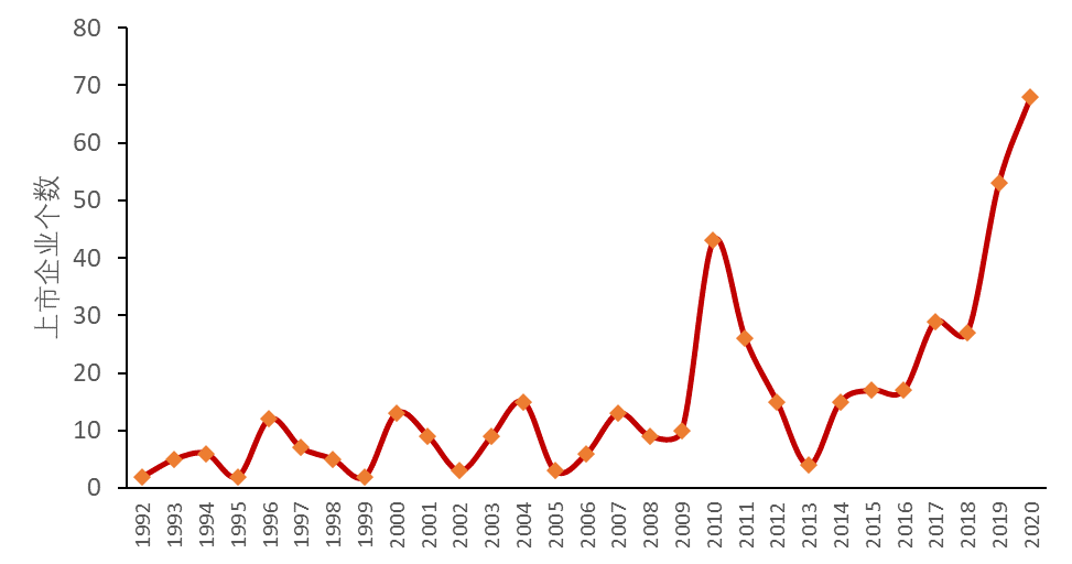 新经济500强中上市企业数量逐年递增,1992-2020年均新增上市企业15.34家,2010年出现第一个峰值,单年上市企业43家,占500强总上市企业总数的9.34% ,其后2019年、2020年持续攀升,分别为53家和68家。