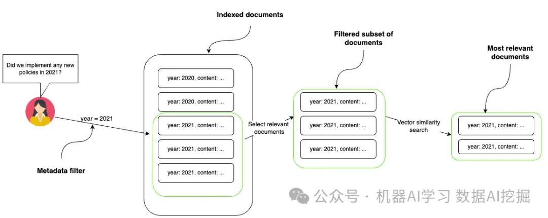 如上图所示中,流程从用户询问2021年是否有实施新政策开始。然后使用元数据过滤器根据指定的年份(在这个案例中是2021年)来筛选大量索引文档。这将产生仅来自那一年的过滤后的子集文档。