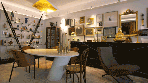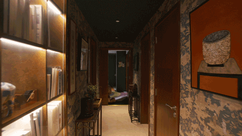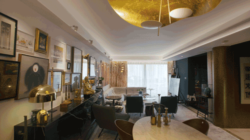 他们用黄铜将L型的承重墙包裹起来,并做了一个黄金书架。黄铜会随着时间的变化,表面材质也会发生一些变化,汪昶行说:“你半年前来看,这个黄铜会更加偏黄一点,现在颜色会更深一点,以后还会不一样。”![]()