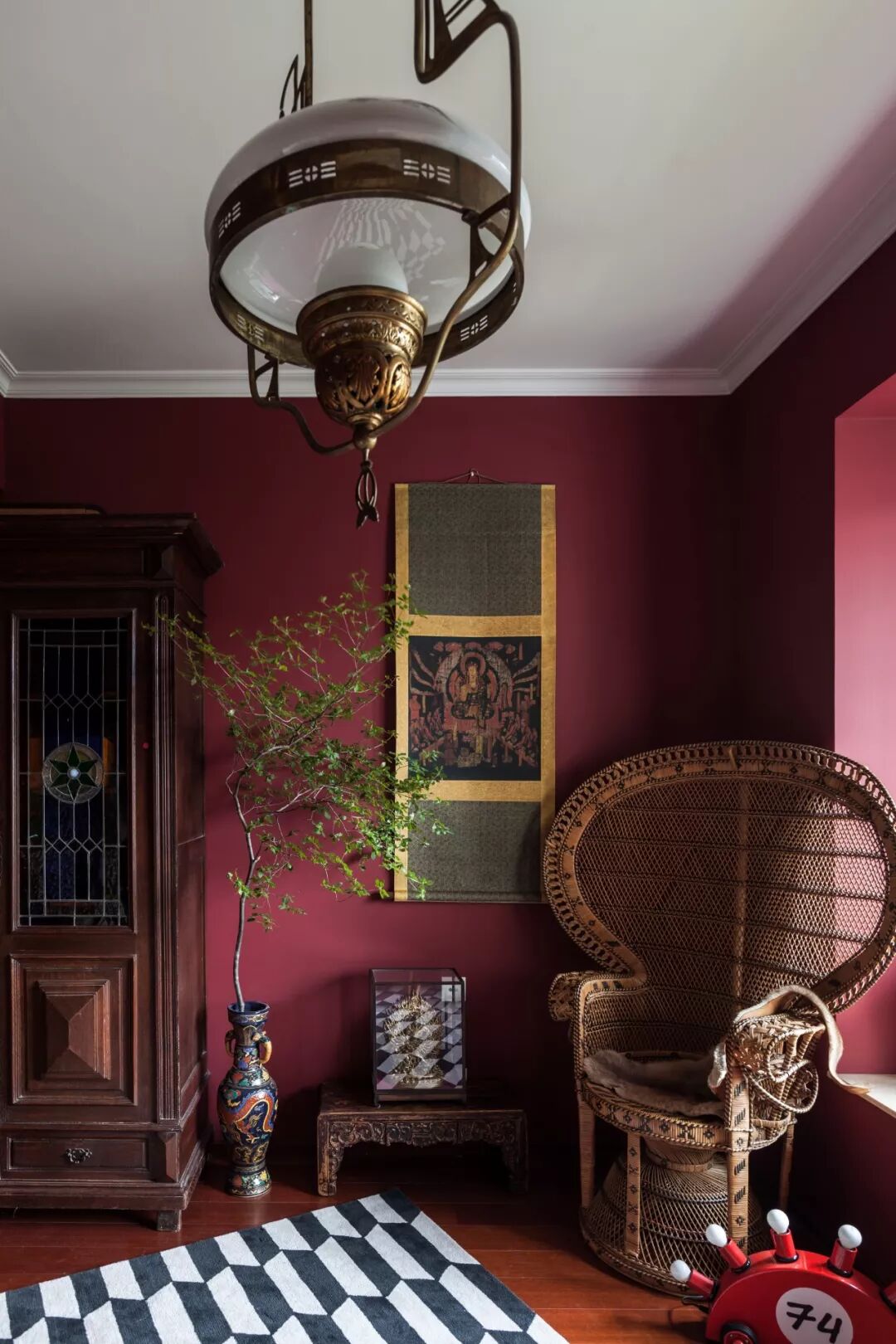尽管两个人都有留学的经历,但随着年龄的增长,汪昶行觉得自己对中国文化的热爱越来越多。现在,很多人家里都会往北欧、日本这种比较简约的感觉靠,但汪昶行认为,作为中国人,家还是要有些中式风。茶室用了故宫红,其实是一种朱砂红,书房则用了孔雀绿。“中国皇家宫廷里面,它的颜色是非常大胆的,会用绿色,红色,包括一些比较跳的蓝色、金色等等。”汪昶行觉得,在一些不会久待的小空间里面,其实是非常适合用这些古典的颜色去搭配的,这样会让整个空间显得比较特别,带出一些中式的味道,也能给人带来一些创作灵感。如果再有一两件能体现中国文化的老东西,比如一幅字画、一把椅子、一件瓷器,就能够有效地体现出中国人家里的感觉。但家毕竟不是博物馆,不应该哪里都那么戏剧化,所以在卧室、客厅这些地方,夫妻俩用的还是白色这样比较明快的颜色。![]()