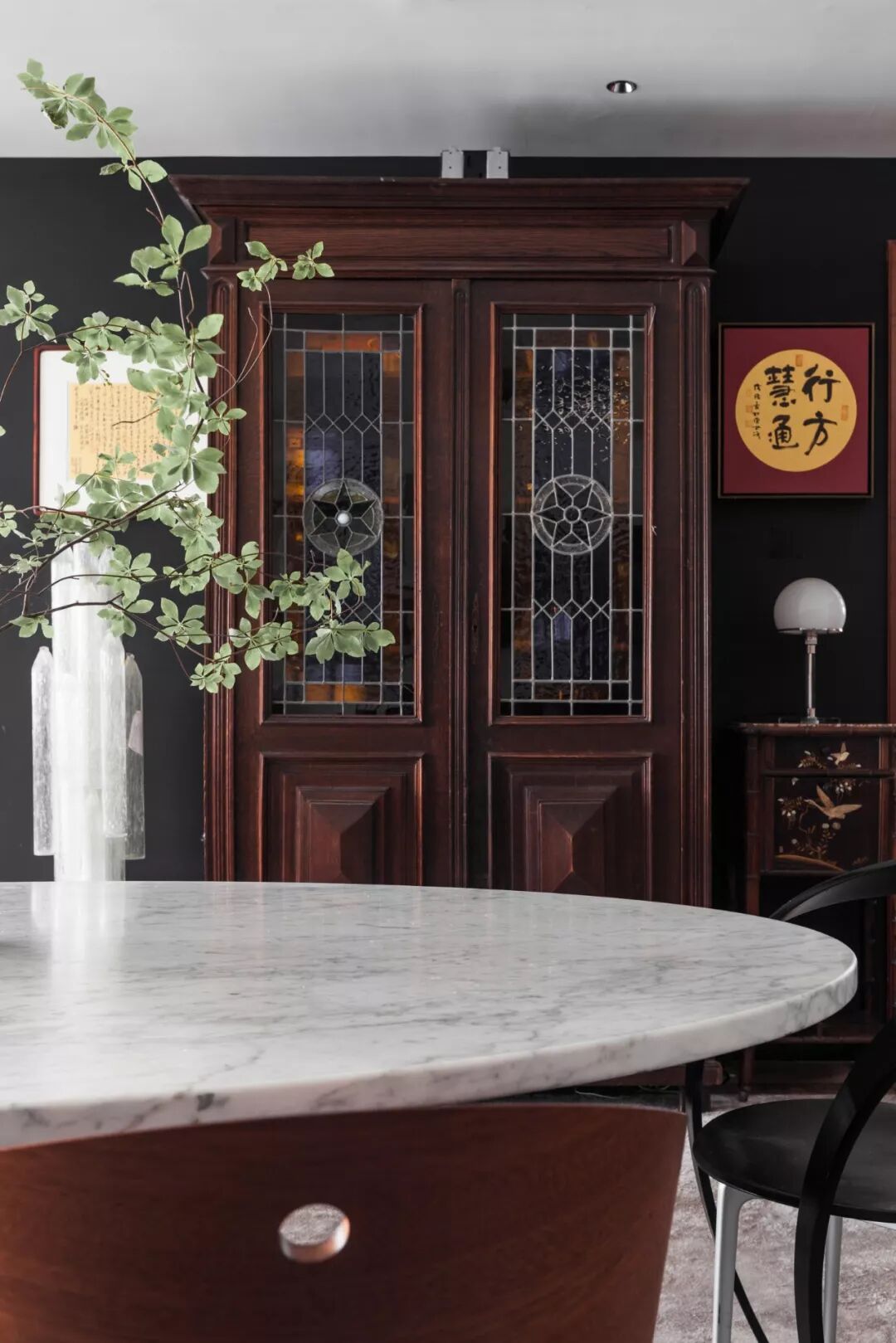 客厅的五斗柜是典型的海派家具,整体使用的是柚木的材料,门板上有点像教堂彩色的玻璃,中西混搭,是海派家具的典型样式。情人椅,是汪昶行在上海一家老家具的买手店里面买到的。看到的时候,它被放在了一个角落,布满了灰尘。但因为椅子独特的造型,他一下子被吸引住了,想起自己在法国也看到过类似这样的椅子。买回来后,他做了一些简单的处理,后来发现这其实是一张情人椅,是两个人谈恋爱的时候坐的一种椅子,坐在上面正好可以脸对脸看着对方,形式很好玩。