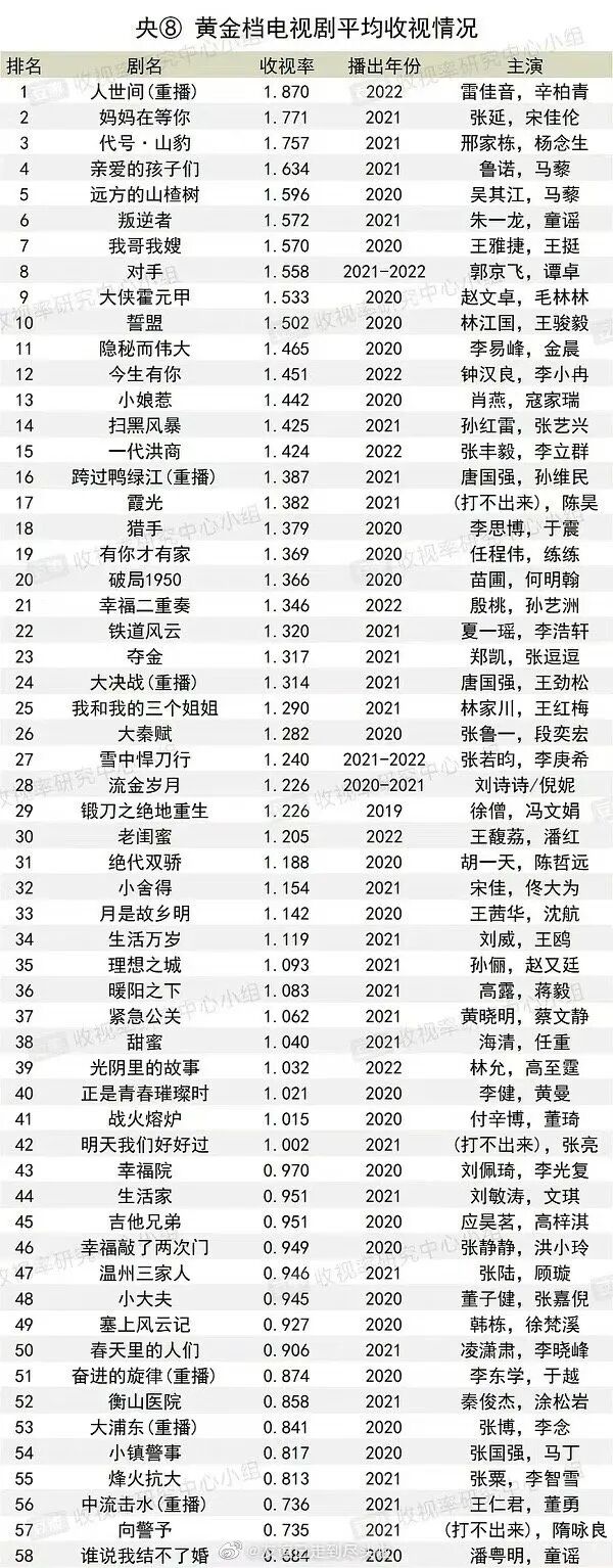 央八黄金档平均收视率(2020-2022)数据来源:豆瓣@收视率研究中心,微博@友谊已走到尽头