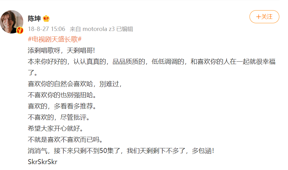 一部作品的衡量维度,当然不应该只有收视。从作品质量上看,陈坤选择的剧基本过关。这从《天盛长歌》和《风起陇西》8.2和8.1的评分中,能看出一二。在社交平台上,看完全集的观众对评价也偏向正面,但问题是,很少有观众能看完全集。