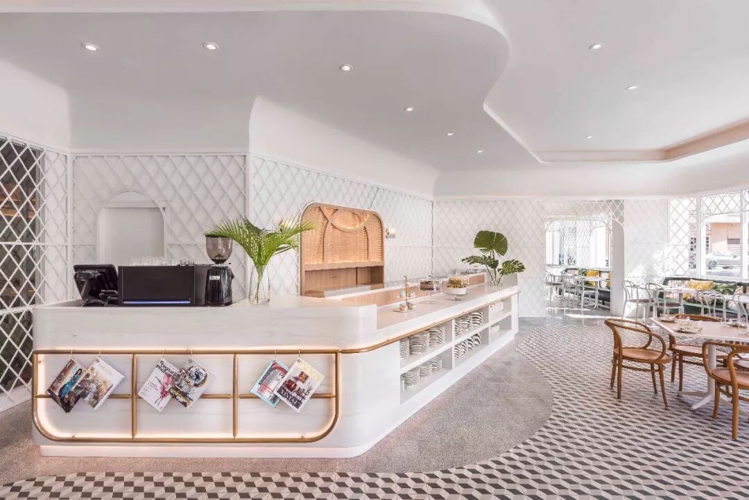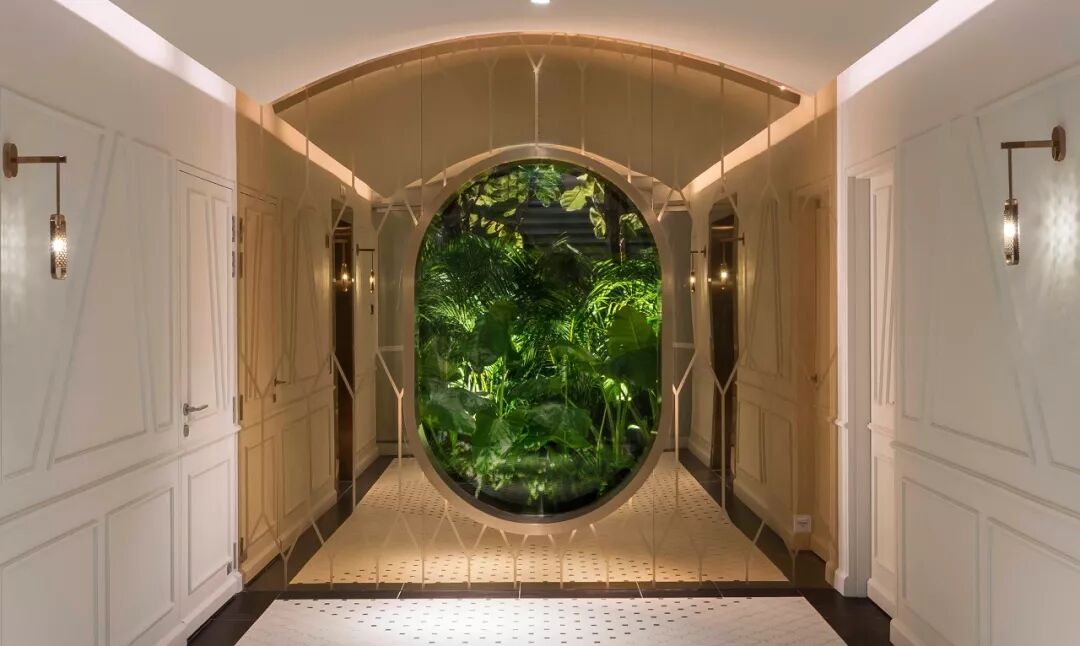 温室餐厅(The Glasshouse)的设计灵感来自于英国维多利亚风格的温室。餐厅中将格状金属框架与玻璃窗相组合,营造出温室花园般的惬意氛围,为客人们提供早午晚餐的多种选择。沙发靠枕采用了热带植被图案,与周围的绿色植物完美交融,打造出一个迷人的“热带伊甸园”。镜子作为魔术中无处不在的道具,也被运用于餐厅的墙面上,创造出多重空间的错觉。The inspiration for The Glasshouse came from the English Victorian conservatory. The studio applied the lattice pattern to the metal framed walls and glazing of the Glasshouse restaurant, presenting it as a delightful garden conservatory for breakfasts, lunches and dinners. A mix of real plants and tropical prints were used for the sofa cushions to add to the allure of being in a “Tropical Eden”. The mirror, a ubiquitous tool for the magician, is deliberately used to clad the end walls to create the optical illusion of multiple rooms. ![]()