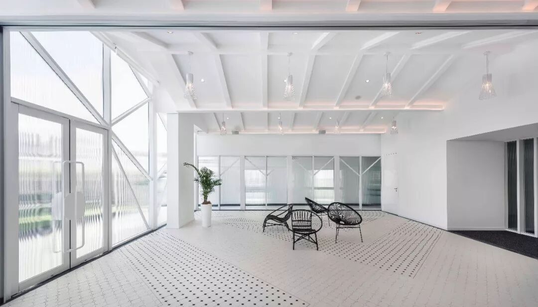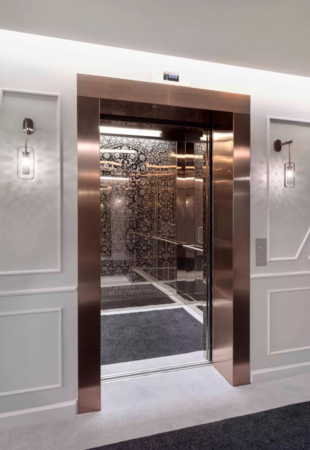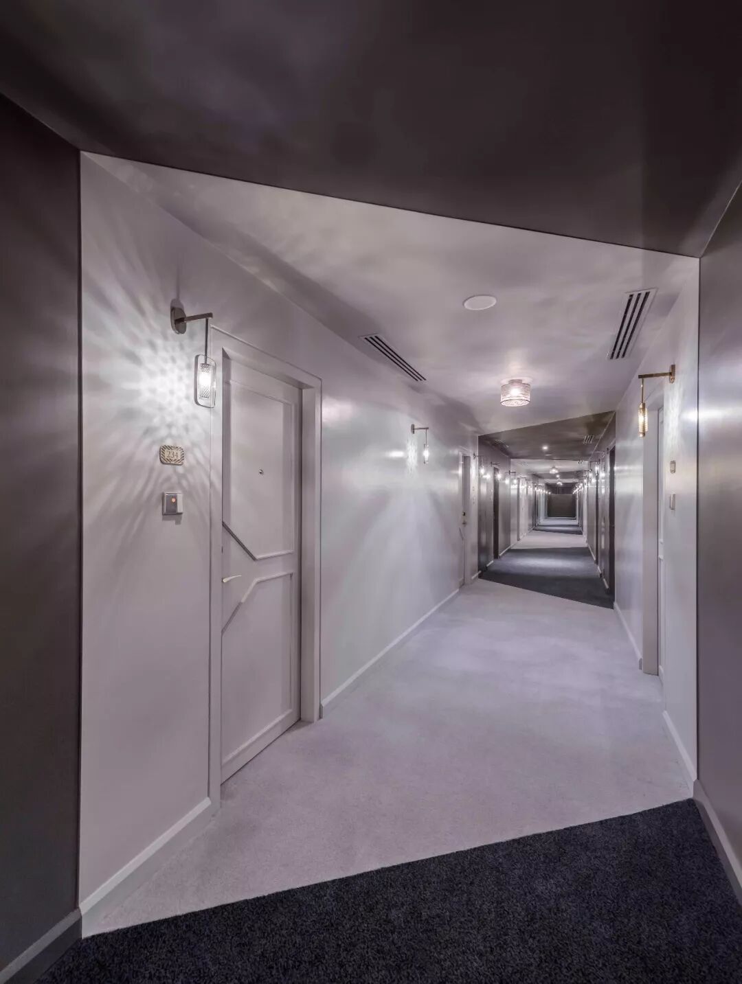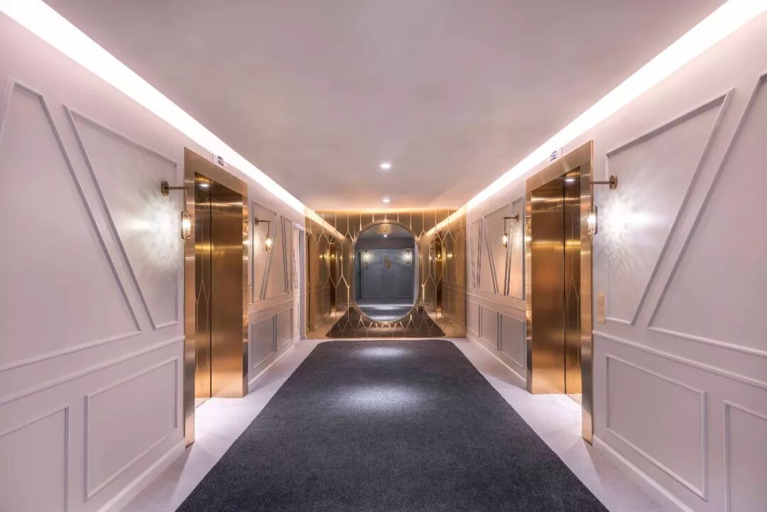 设计团队将明暗交替的色彩方案运用于客房廊道的设计之中,由此打破因狭长走廊格局带来的乏味感。走廊墙面上有序地排布着一盏盏壁灯,机械化的特色照明有规律地旋转着,并透过格状材料映射出错综斑驳的光影,产生奇迹般的动画旅程。这种视觉动画及讨巧错觉手段,其实是借助了魔法幻象中的经典技术“烟雾和镜子(smoke and mirrors)”,由此呼应不寻常的场地特色。The studio alternated dark and light color schemes along the guestroom corridors, to break down the potential monotony of the corridor experience. Mechanized light features were placed at regular intervals, to rotate and cast shadows of intricate lattice patterns to animate the guest journey. This visual animation and trickery (smoke and mirrors) was thus borne out of a response to the unusual specificity of the site.![]()