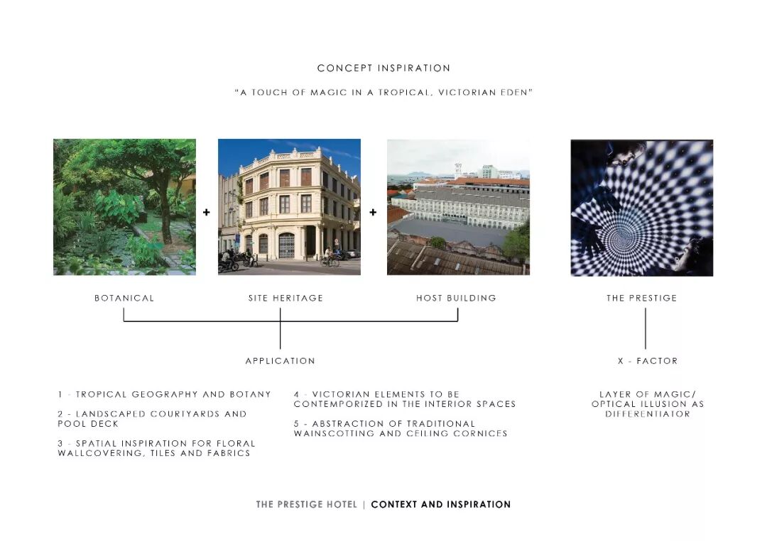 酒店被命名为“The Prestige”,意在希望能如魔法般地召唤出优雅精致的酒店品牌形象,并且其灵感也来自于由Christian Bale主演的电影《致命魔术》(The Prestige),背景同样设定在维多利亚时代,讲述了关于魔术的幻觉艺术。Named “The Prestige” to conjure brand imagery of elegance and sophistication, it also takes cues from the movie The Prestige starring Christian Bale, which was set in the Victorian era, (similar to the area’s context) about the illusory art of magic.