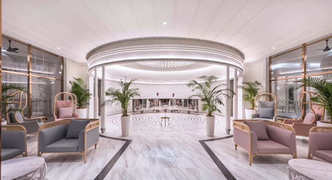 “Elements of visual animation and trickery: Smoke & Mirrors”“视觉动画及讨巧错觉元素:Smoke & Mirrors”首层的下客区,通过采用黑白图案的地面,微妙地将接待处、温室餐厅以及零售空间整合起来,仿佛在眼前呈现“出现与消失”的魔法幻象。在接待区域,设计团队借用了许多好玩儿的魔术幻觉手法,客人们需要经过由白色大理石和黄铜部件组成的迷宫地面才能到达前台。定制的接待台由镜面不锈钢制成,并像被施了法似的立在了铬合金球体之上,而接待台背后的弧形墙面采用了云朵图案护壁板,在维多利亚室内风格的基础上展现出古灵精怪的现代设计元素。At the Ground Floor drop-off, one subtle intervention to unify the Reception with the Glasshouse Restaurant and retail spaces, is the black-and-white floor pattern, which seems to magically “appear and disappear” before your eyes. In the reception area, we introduced several tongue-in-cheek references to magical illusion, where guests navigate a custom designed white marble-clad maze with brass trimmings on the floor, to get to the reception. The custom reception desk made of mirrored stainless steel, magically appears to balance on chrome spheres, and a cloud wainscot adorns the curved wall behind the reception desk, showing a modern whimsical take on Victorian interiors.![]()