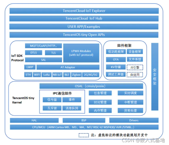 TencentOS tiny是腾讯面向物联网领域开发的实时操作系统,具有低功耗,低资源占用,模块化,安全可靠等特点,可有效提升物联网终端产品开发效率。TencentOS tiny 提供精简的 RTOS 内核,内核组件可裁剪可配置,可快速移植到多种主流 MCU及模组芯片上。而且,基于RTOS内核提供了丰富的物联网组件,内部集成主流物联网协议栈,可助力物联网终端设备及业务快速接入腾讯云物联网平台。