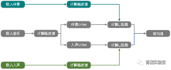 训练时的一组数据为(音乐,伴奏,人声),要求三者在时间轴上尽量完全一致,提取三者频谱并计算出幅度谱。将音乐幅度谱分别输入到人声U-Net和伴奏U-Net中,得到预测的人声U-Net和伴奏U-Net,分别计算预测结果和标准结果的距离并取均值。其中伴奏U-Net和人声U-Net内部参数会随着数据输入不断更新。