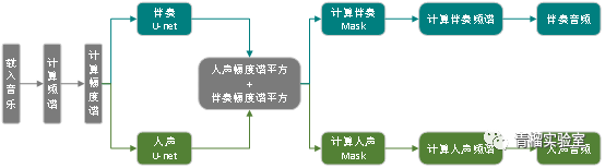 预测过程没有标准的人声和伴奏,只有混合后的音乐。当预测出伴奏和人声的幅度谱之后,Spleeter将两者分别进行平方,得到人声能量Engv和伴奏能量Enga,然后使用Maskv = Engv/( Engv +Enga)计算出每个时刻人声在各个频段音乐的占比,同时使用Maska= Enga /( Engv +Enga)计算出每个时刻伴奏在各个频段音乐的占比。利用输入的音乐频谱分别乘以Maskv和Maska得到人声和伴奏频谱,最后使用逆STFT得到人声和伴奏的WAV音频文件。