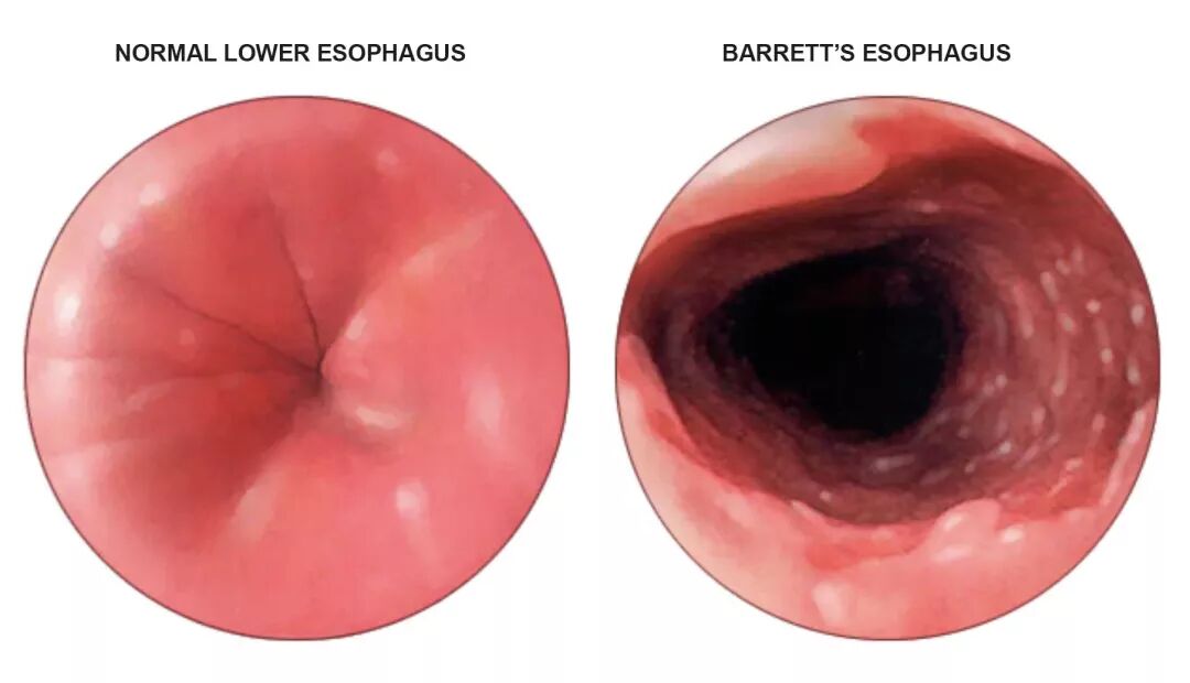 正常的食管下段vs巴雷特食管。巴雷特食管缘于食管接触大量胃酸,导致其内壁或黏膜在分子层面上发生变异 | Mayo Clinic