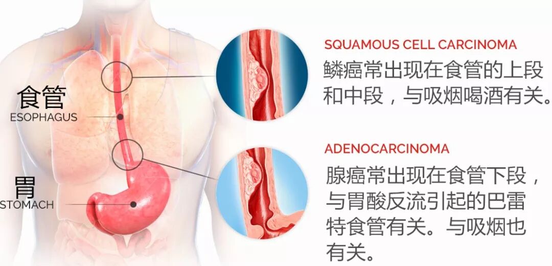 世界上的大多数食管癌都会被划分为鳞状细胞癌(squamous cell carcinoma),它一般出现在食管的上段和中段,与吸烟喝酒有关。