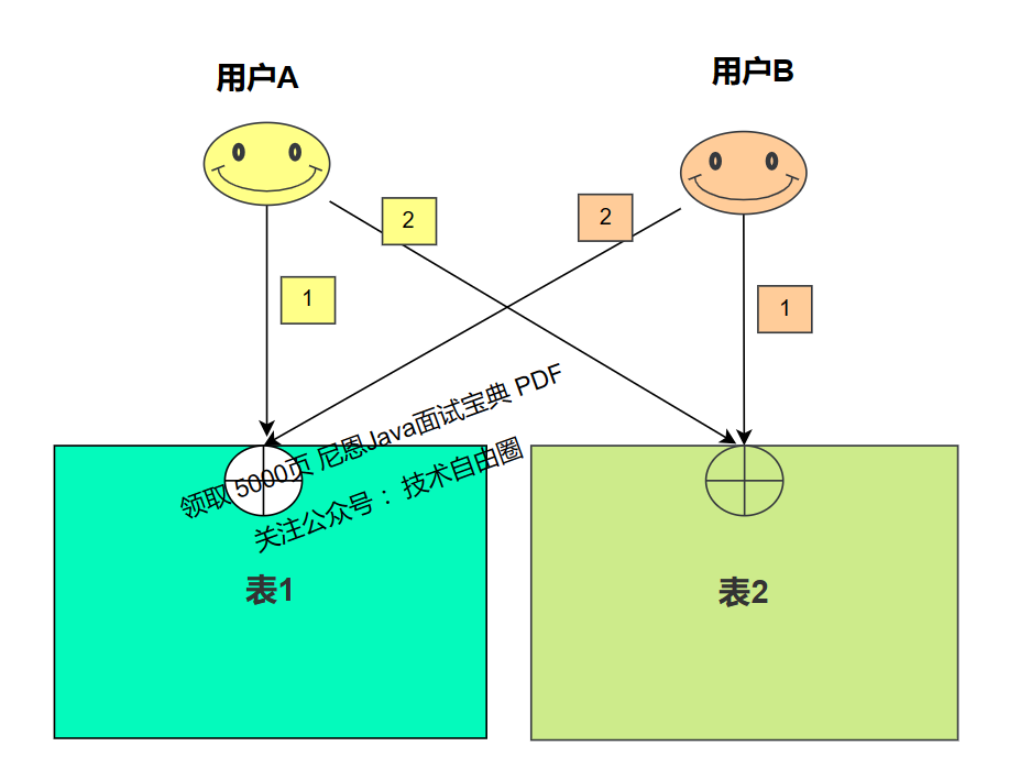 - 用户A由于用户B已经锁住表2,它必须等待用户B释放表2才能继续,