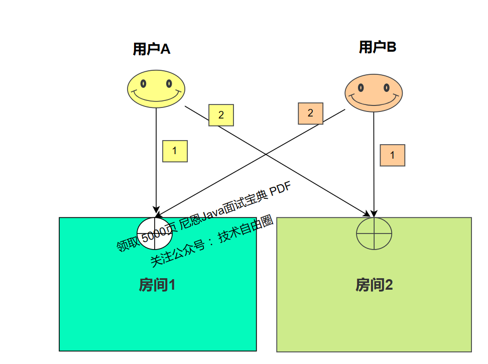 是指两个或两个以上的进程在执行过程中, 因争夺资源而造成的一种互相等待的现象,此时称系统处于死锁状态或系统产生了死锁,这些永远在互相等待的进程称为死锁进程。假设有两个事务 A 和 B,它们同时试图获取对方持有的资源,但又都在等待对方释放资源,导致了僵持不下的局面。举个例子,假设有两个人 A 和 B,他们同时想要通过一扇门进入一个房间,但这扇门只能由一人单独打开。- A 想要进入房间1,但门被 B 挡住了,所以 A 无法进入,于是 A 抓住了 B 的右手,不让 B 打开房间2的门。