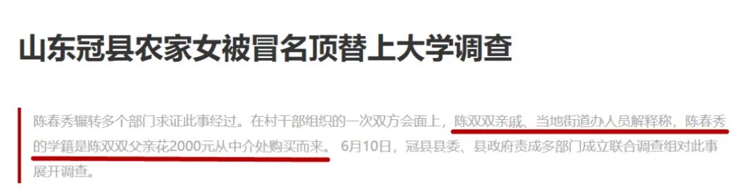 整个顶替事件,就是陈双双的父亲通过中介,花了2000元买了个学籍入学。