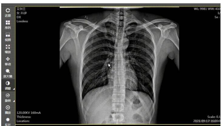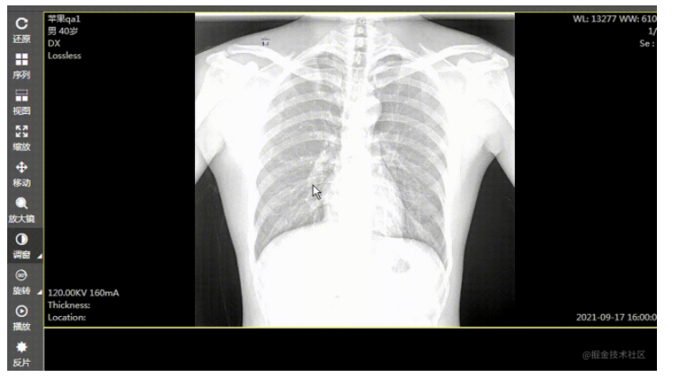 医学检查影像显示里边,调窗是一个基础的常用操作:通过滑动鼠标来改变窗宽窗位的大小,窗宽(宽度)、窗位(中心点)其实就是一个像素数值的区间,图像的所有像素点的像素值在这个区间的就显示,不在区间的就不显示。