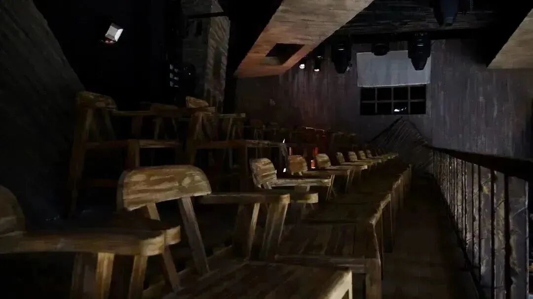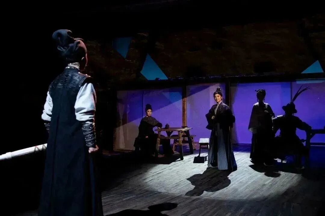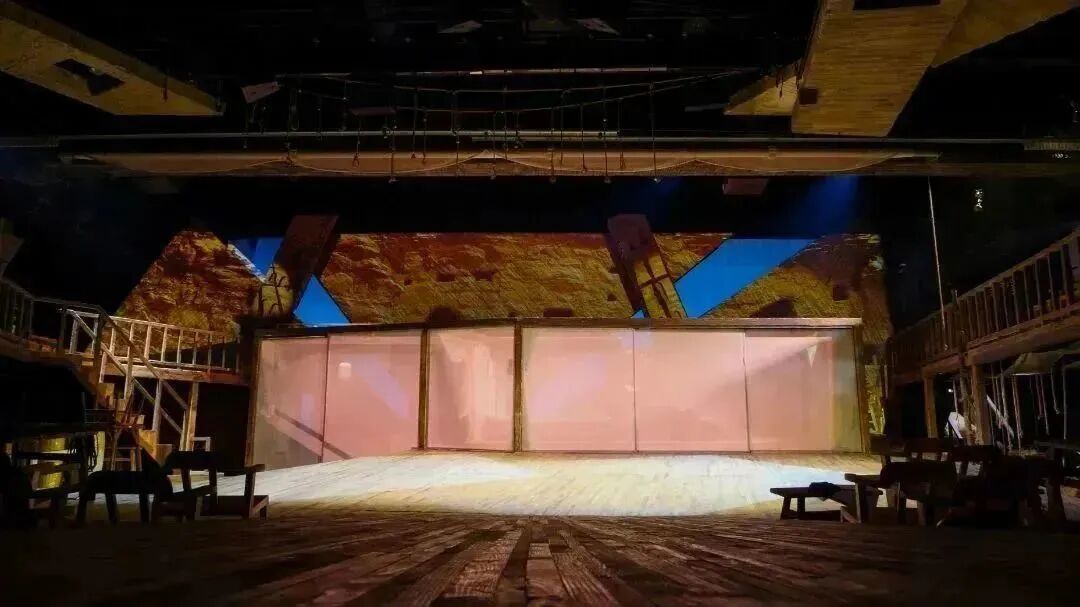 走进剧场,狂沙吹上客栈石墙和招牌的猎猎风声,带来一种肃杀的大漠气息。整个剧场被制作成了一间布满机关暗道的“龙门客栈”,观众席就位于其中,眼前是古朴木制的桌椅,身边是令人沉醉的美酒。舞台,不只是你面前的一小块区域,而是打破了传统剧场的空间样式,灯光、音乐,也配合着营造出一种浓厚的“氛围感”。