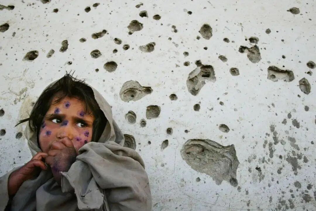阿富汗喀布尔的7岁女孩患有利什曼病,她的皮肤上布满有如弹孔的斑纹。许多儿童都因细菌感染患上这种皮肤病