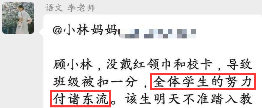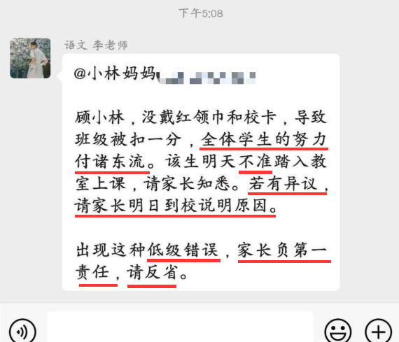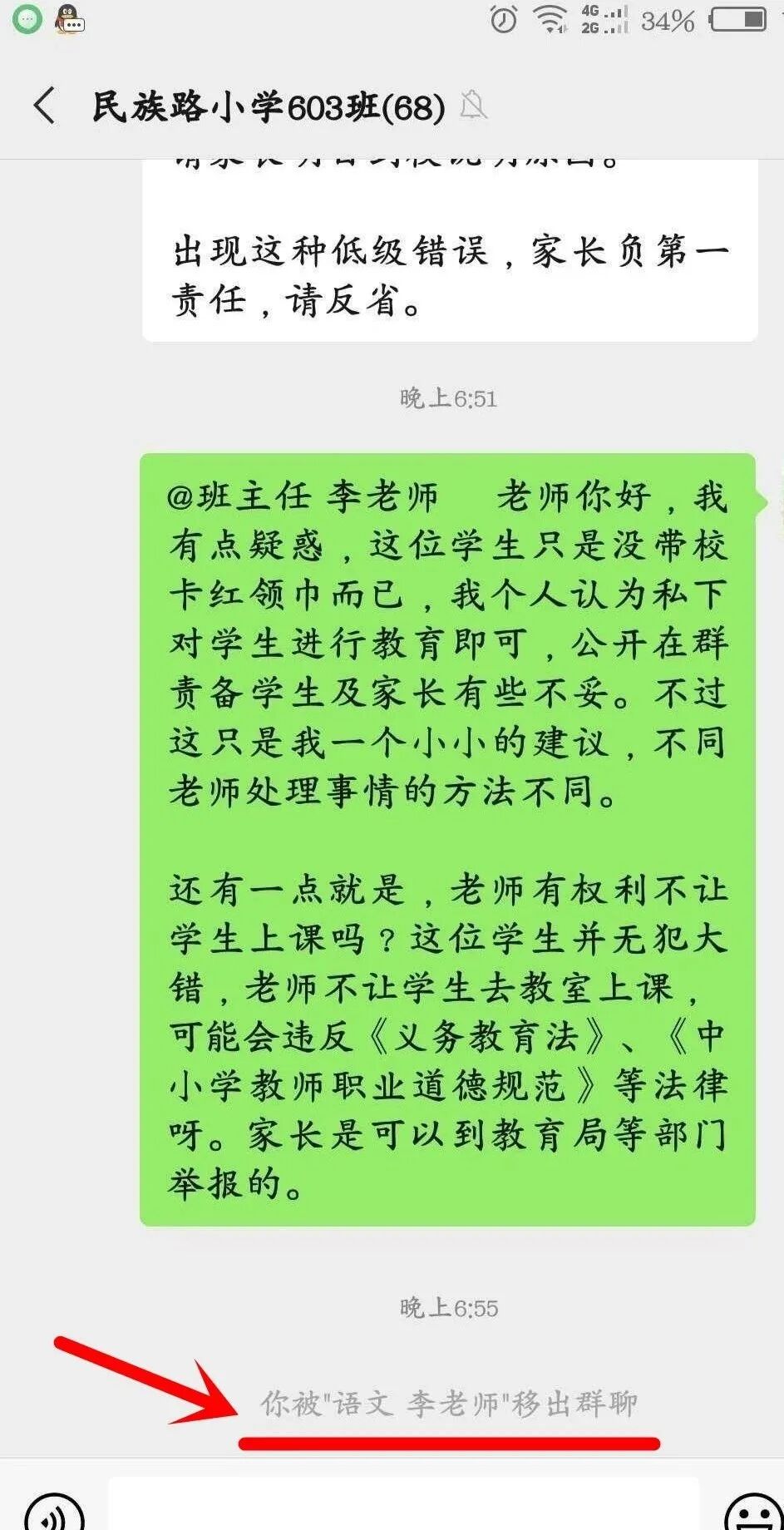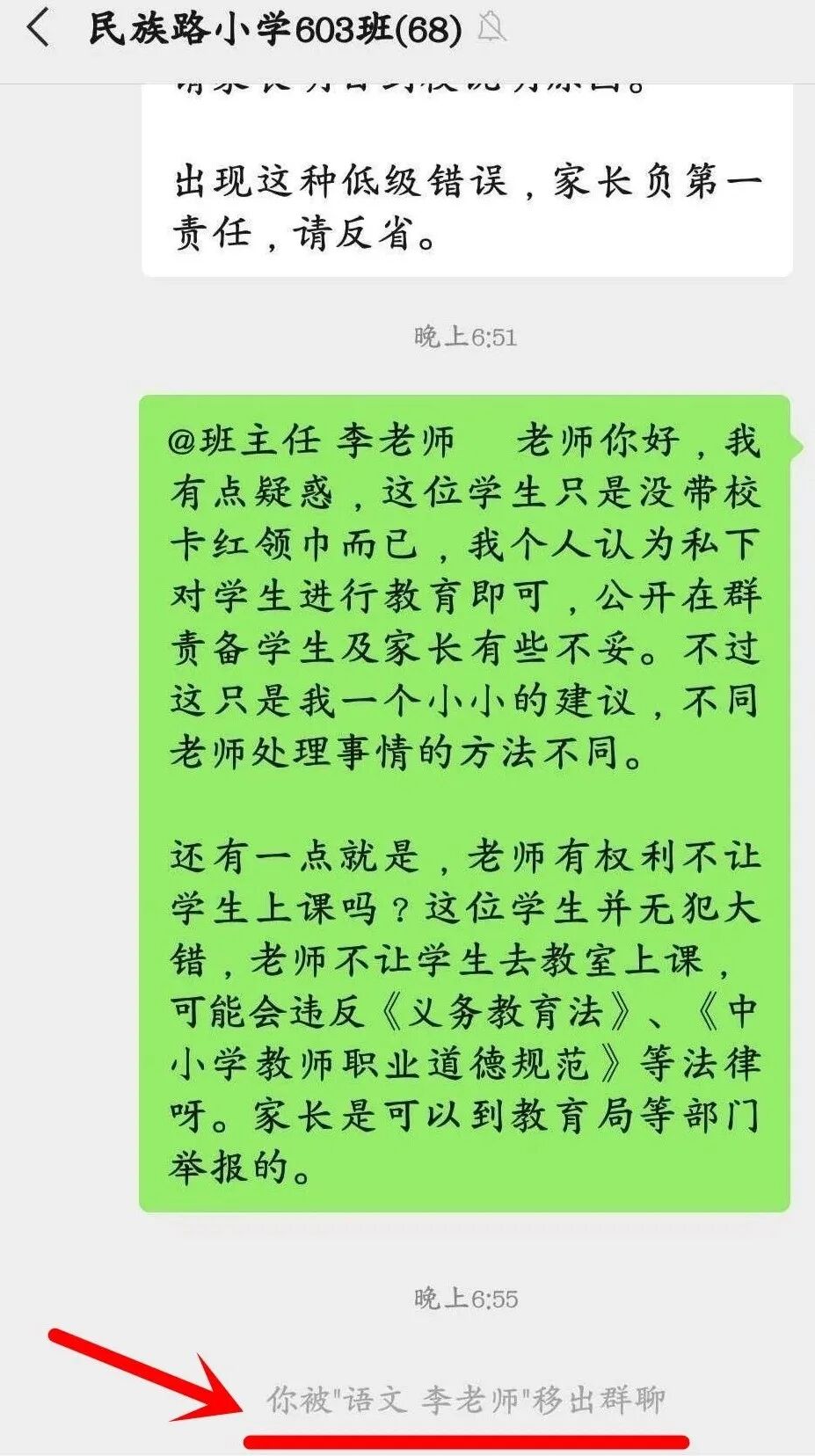 近日,一位大V在网络上曝光出的几个聊天截图,引起了网友的广泛热议。这个聊天截图的内容,是某班级的一位小学生因为上学忘带了红领巾和校卡,便被他们班的班主任当众在家长群里宣布——该生明天不准再踏入学校教室上课,而且要求犯此低级错误的、负第一责任的该生家长,明天到学校说明原因:忘记带红领巾和校卡去学校,的确是学生和家长有错在先,但是这样的错误,真的可以用不允许学生到校上课作为处罚吗?要知道《中华人民共和国教育法》第29条第二、三款规定,学校有保证教学质量和维护受教育者合法权益的义务;而《宪法》第四十六条也规定,中华人民共和国公民有受教育的权利和义务...所以这个事发生后,家长群里的一位家长看不下去了,于是这位家长站出来表示——该生只是忘带红领巾而已,私下批评教育即可,随意对学生停课是违反法律规定的:然而这位家长话音刚落下,自己还啥都没反应过来,就直接被班主任直接踢出群聊了:自己违法了却不让人说,还把人剔除家长群,这是什么操作?身为老师,身为班主任,有这么霸道且不讲理的吗?例如一位家长就在家长群里表示:“老师只是想培养学生的团队精神而已,言语过激可以理解,如果你是老师,每天面对小孩你心情也不会好,所以没必要搬出法律法规吓唬老师,应相互理解,和谐共处。”而这位家长说完这话后,后面立刻跳出来一群家长跟着附和:此事被曝光出来后,无数网友都看不下去了,网友们纷纷表示:关于网友的这些评论,其实我是支持的。因为我也反对这位老师的这种行为。我反对这位老师不仅是因为他违法,还因为他用了一个很鸡贼的管理策略,这个管理策略就是——挑动群众斗群众。仔细看一下这位老师在家长群里发的通告你会发现,这位老师其实就是在转移矛盾:表面上看,这位老师如此生气的原因,是因为一位学生忘带红领巾而导致班级被扣一分。但是被扣一分,真的值得这位老师如此大动干火到家长群里宣布学生不能踏入学校,且还要家长亲自去学校解释原因吗?