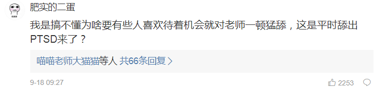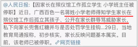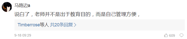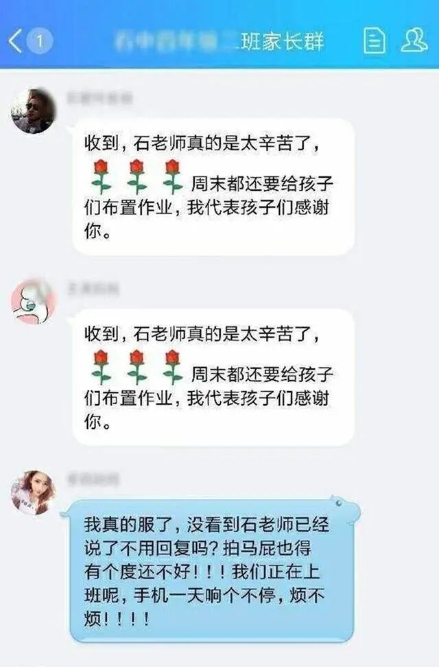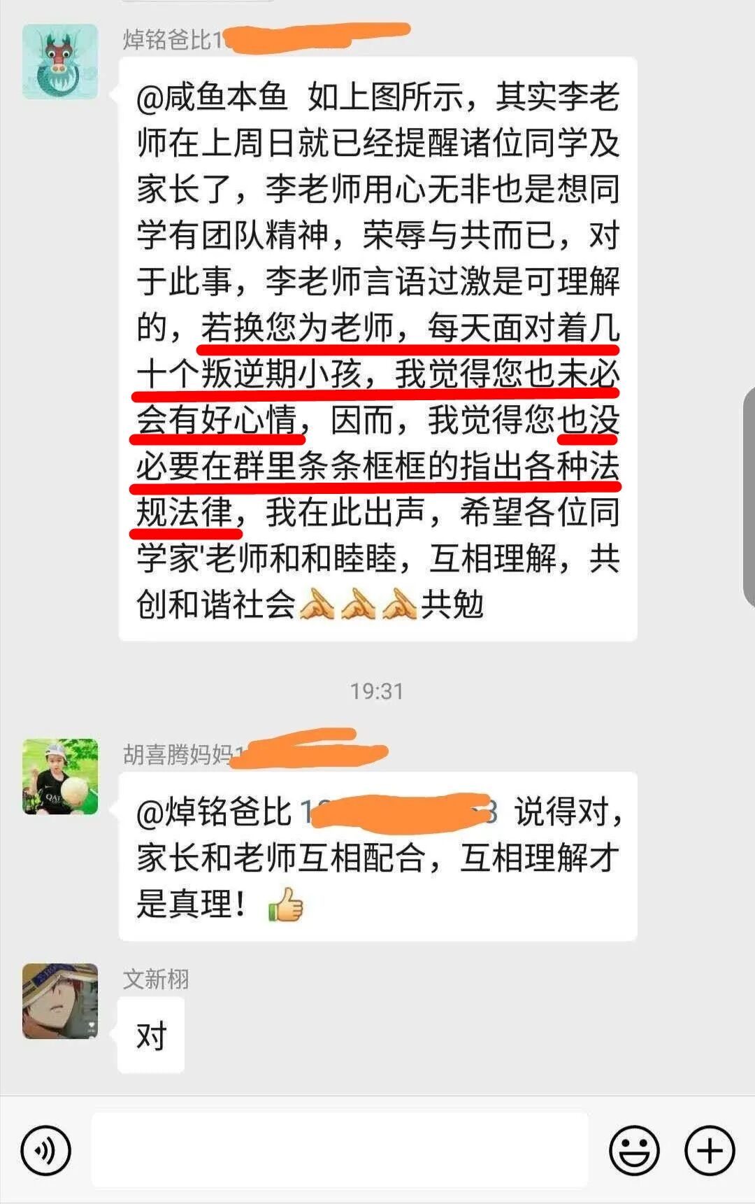 大概率不是。其实这位老师之所以大动肝火,最主要的原因应该是因为被扣这一分后,这已经影响到他个人的评优、评先进或奖金等个人利益了。但是被影响到个人利益又不能直说,该怎么办呢?于是他把犯错的学生和家长放到全体家长的对立面上,用“因为你一个人犯错使大家的努力付之东流”这种话,联合集体来敌对这个使自己个人利益受损的人,这就叫“挑动群众斗群众”。其实“挑动群众斗群众”这种管理策略,在疫情初期也曾经出现过。例如病毒刚出现的时候,某位蔡姓领导,在担心某医生对外发出预警会影响到其个人利益后,她便找到这位医生,训诫道:“你视我市的城建结果于不顾;你是影响我市安定团结的罪人;你是破坏我市向前发展的元凶...”这种为了自己的私利,便把一位医生拉到一个城市的对立面,利用集体压死这个不配合自己的人,这就是“挑动群众斗群众”。在所有的管理策略中,“挑动群众斗群众”、“挑动员工整员工”这类管理策略,其实是最阴暗且最能制造恐怖氛围的,而这种管理策略也真的能蒙蔽一部分国人的心智,这真是一件令人悲哀的事情。现如今,不知从何时开始,我们家长群里的“舔狗家长”已经越来越多了。例如学生忘带红领巾去学校就以不让学生去学校上课作为处罚,这种在老师已经明显违法的情况下,竟还有舔狗家长出来舔的:再如之前的缪可馨事件,在孩子已经没了的情况下,竟还有一群家长出来舔老师,说老师没有一点问题的:还有之前的蒋老师事件,一位蒋姓老师由于觉得一个孩子的母亲在殡仪馆工作阴气重,便孤立其孩子且公开辱骂此家长,被官媒曝光后却还得到一堆家长支持的:还有在家长群里给老师无聊的打招呼,最后还有家长跳出来声称要给老师买早餐的:还有天气转凉后,便有家长在群里提醒老师多穿衣服,最后竟演变成一群人给老师吟诗拍马屁的:![]()