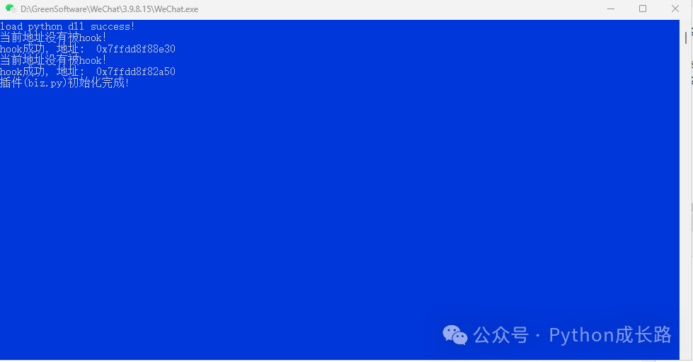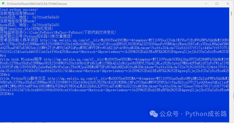 启动并登录微信,执行这个main.py就会把Python注入到微信并且打开控制台。只要收到公众号的文章推送,控制台就会打印出来