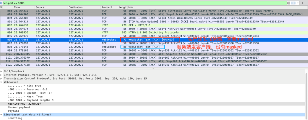 FIN=1, 表示是当前消息的最后一个数据帧。服务端收到当前数据帧后,可以处理消息。opcode=0x1,表示客户端发送的是文本类型。