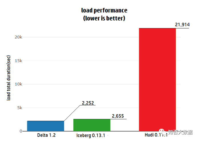当从 Parquet 加载数据到我们预期的格式时,Delta比iceberg 快1.17 倍。但是,Delta的整体性能比 Hudi快 9.7 倍。[图表2]