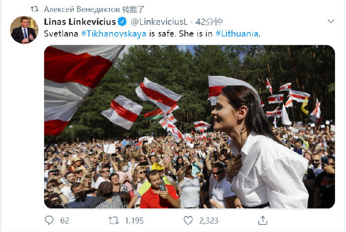 ● 立陶宛外长在推特上宣布,季汉诺夫斯卡娅已抵达立陶宛 / 网页截图
