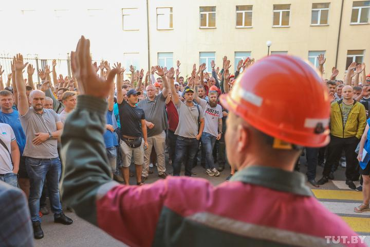 8月10日,戈梅利州白俄罗斯钢铁厂工人首先宣布开始罢工,这成为未来几天全国范围罢工的先声。此后几天,白俄全国大型国企爆发罢工潮,多家企业出现全部工人起立举手宣布自己投给了季汉诺夫斯卡娅、不承认官方公布的选举结果的一幕。
