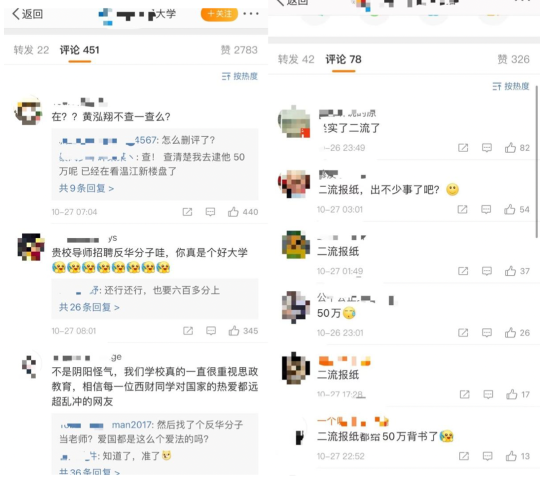 跑到和我们有合作的官方部门、大学微博下面“冲”、阴阳怪气,逼他们下架与我们有关的内容。