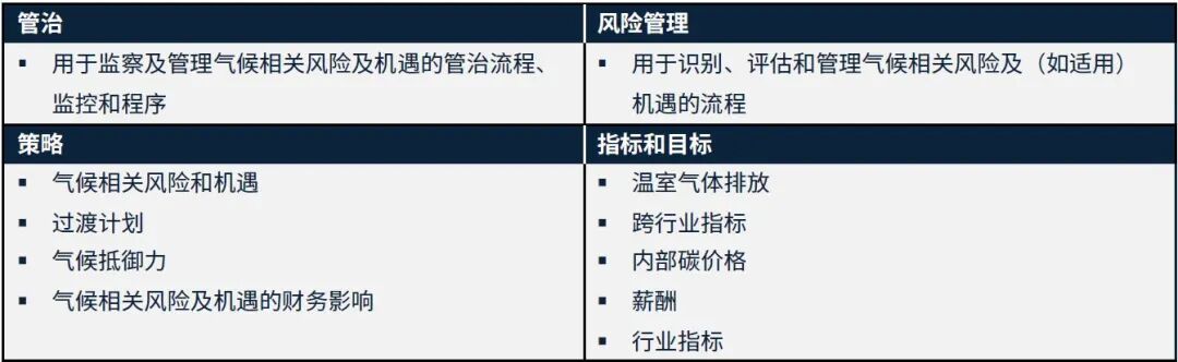 联交所建议规定所有发行人在其 ESG 报告中披露气候相关的信息(即提升目前的 “不遵守就解释” 要求),及推出符合ISSB 气候准则的新气候信息披露要求。ISSB气候准建基于TCFD建议的原则。