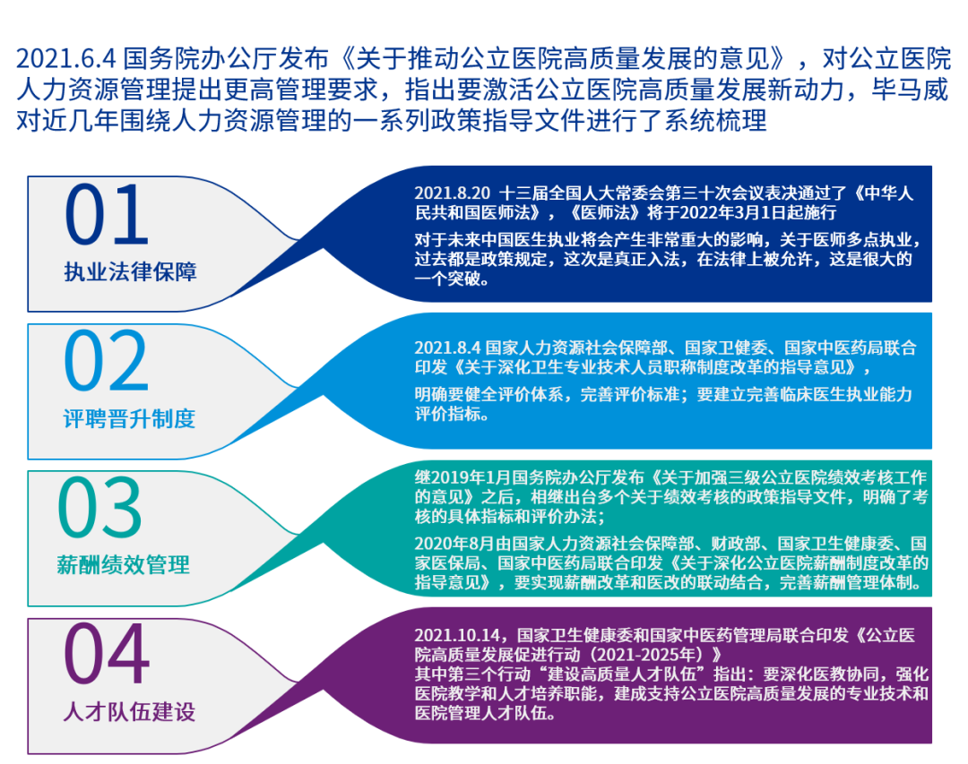 在这其中,医院人力资源管理得到了政策、学术和公立医院的狂热追捧。前有国务院办公厅《关于推进公立医院高质量发展的意见》1对人事管理制度、薪酬分配制度、医务人员培养评价制度等激活公立医院高质量发展新动力不断加码,后有国家卫健委、国家中医药局《关于印发公立医院高质量发展促进行动(2021-2025年)的通知》2提出“建设高质量人才队伍”为重点建设行动。另有第十三届全国人民代表大会常务委员会第三十次会议通过《中华人民共和国医师法》3,将“国家建立健全体现医师职业特点和技术劳动价值的人事、薪酬、职称、奖惩制度。”纳入保障措施。