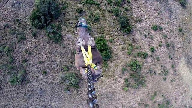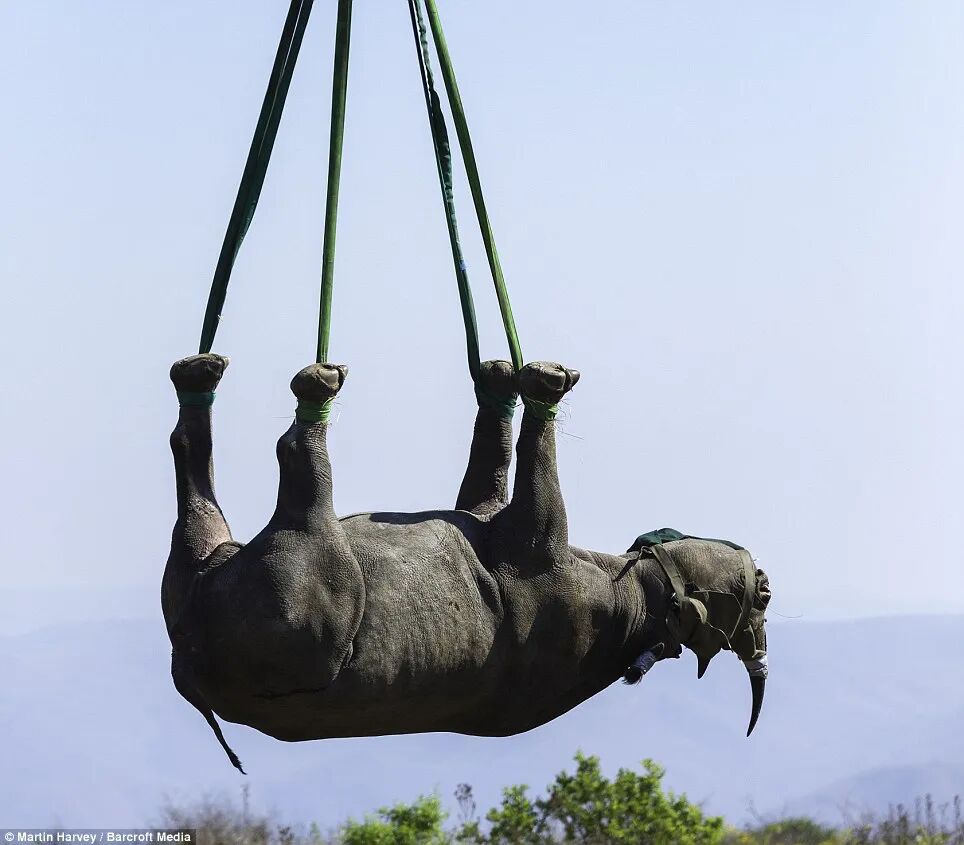 四肢被绳子捆住,眼睛面罩遮盖,倒吊于直升机的下方,在旅行过程中随风摇曳,运气不好还会撞到几只不长眼的飞鸟——这就是犀牛坐飞机的日常。