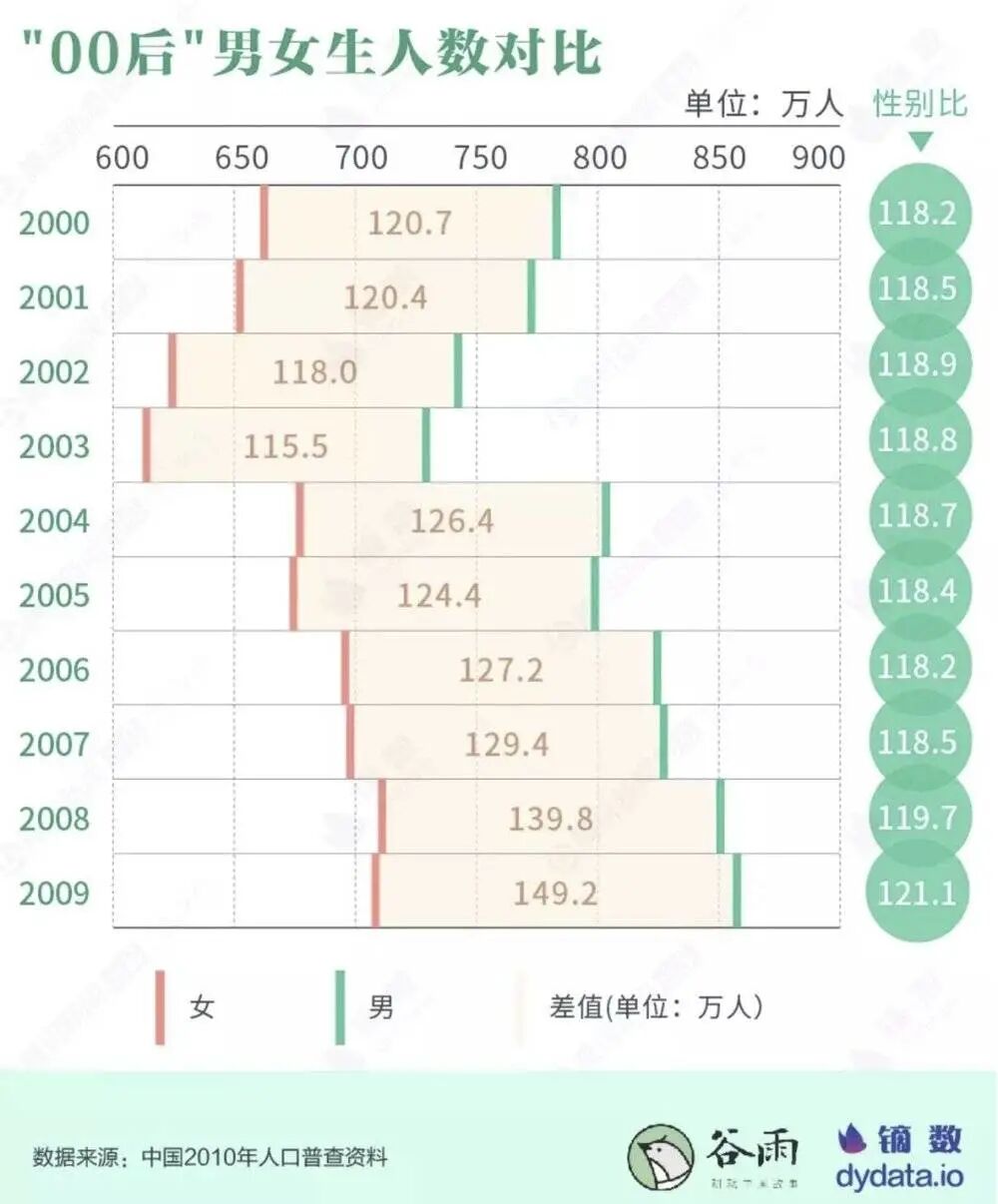 根据国家2010年第六次人口普查年鉴(10年普查一次,下一次在2020年)数据显示,性别比整体呈现出逐渐增大的趋势,男多女少越来越严重:“80后”整体的平均性别比为101.13;“90后”增至110.76,“00后”达到了118.91,