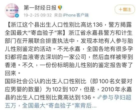国内最大的浙江永嘉“寄血验子”案,参与孕妇超5万人次,涉案金额达2亿元以上。她们大多来自农村,以二胎孕妇为主,为生男孩而选择寄血验子,而当地的男女性别比,已经达到了可怕的136:100。