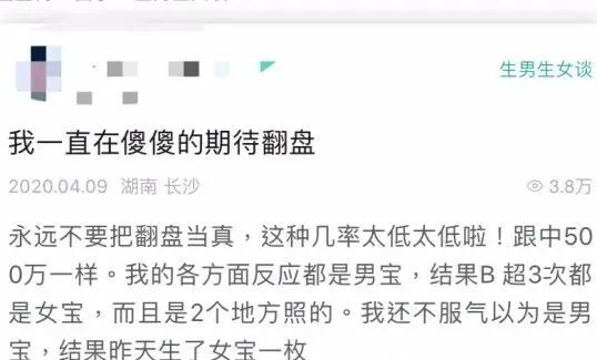 有位网友坚信自己怀的一定是男宝,B超做了3次,换了两家医院测出来都是女孩,依旧倔强。直到女儿降生,翻盘失败,才感慨“这事跟中500万一样难”。