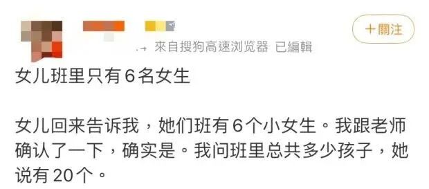 微博有位大V爆料,她女儿班里只有6个女生,其余14个是男生,这是山东一所高端私立幼儿园里面的性别比。