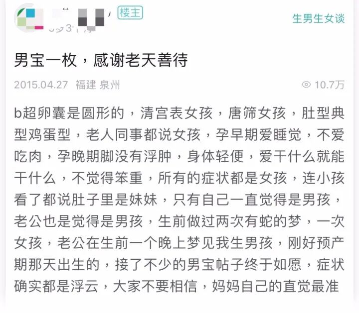 接了不少生男宝帖子的她最终如愿得到儿子,并颇有经验地表示“症状什么的都是浮云,妈妈自己的直觉最准”。